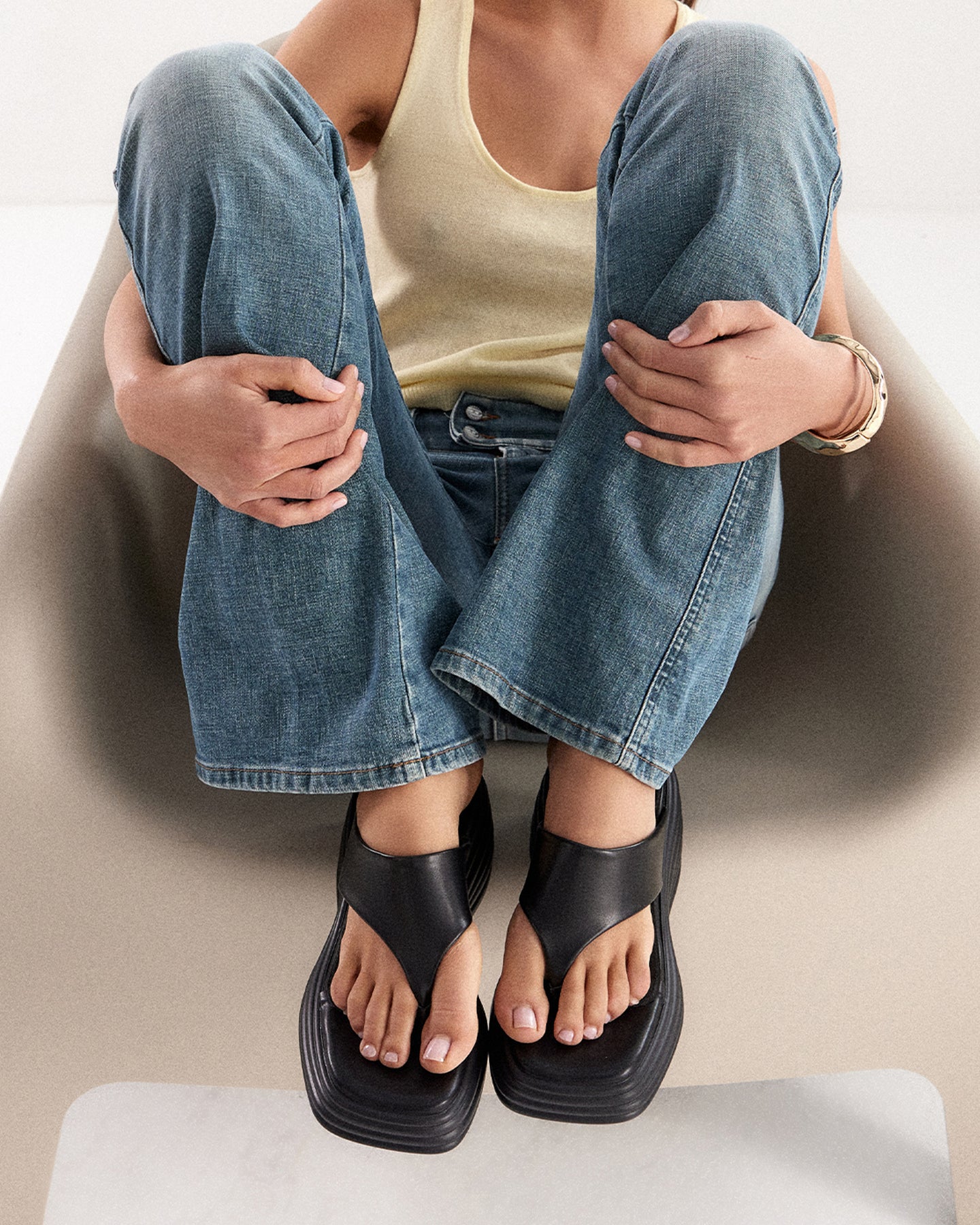 Elevate your look with the Frame Wedge Sandal. Designed with a ripple-textured platform sole, wide thong strap, and modern square toe, this slip-on sandal brings bold style to any outfit. Perfect for summer days, casual outings, or evenings by the beach.